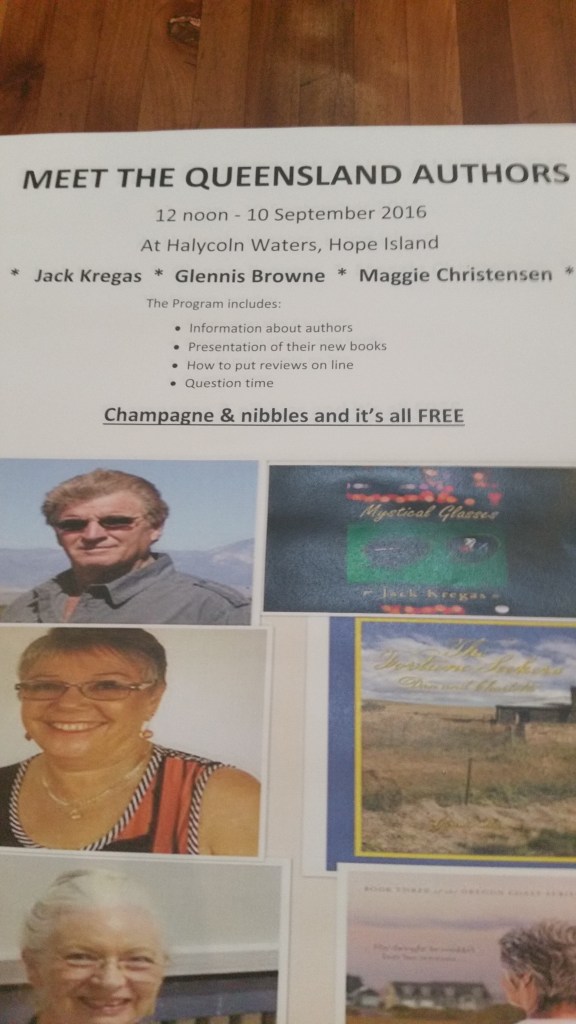 At Halcyon Village on Hope Island, Brisbane, there are three of us – Jack Kregas, Maggie Christensen and myself. I’m hoping my publishers promo fliers have arrived in time. Might need to do a quick print of a large poster just in case. At least the books should be here by then.